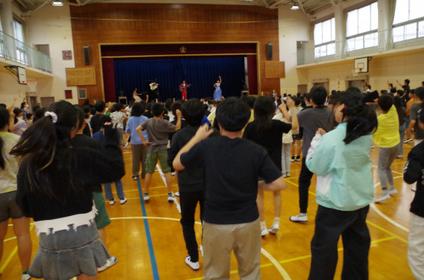 最後にはLARGOのメインパーソナリティ”アキヒコさん”が作詞・作曲・振り付けまでプロデュースされた大人気の曲「ヒコダンス」に合わせて、全校ダンスで盛り上がりました。