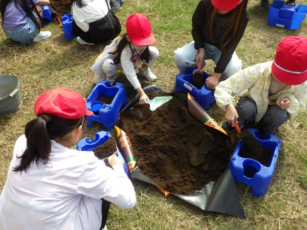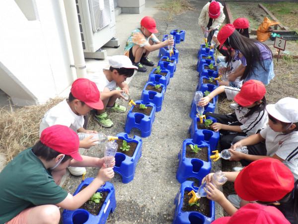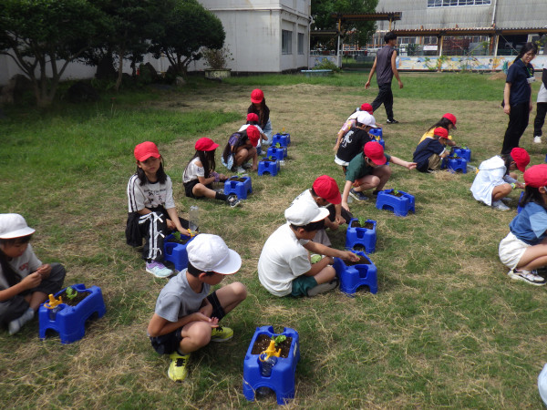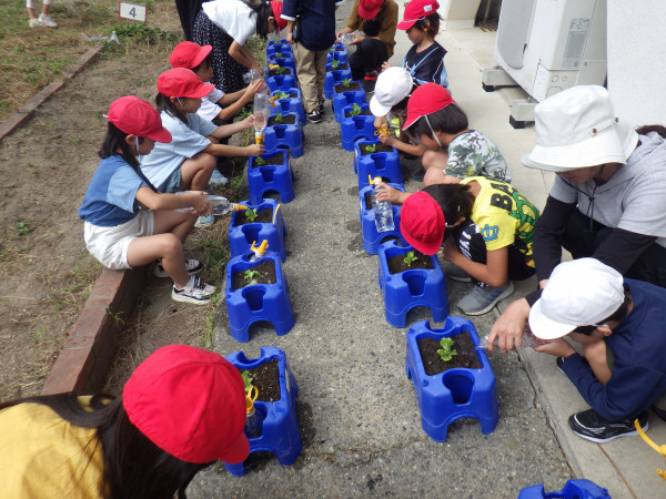 2年生は、生活科の学習の一環で、レタスの苗植えを行いました。今回もJA愛知海部の職員の方をお招きし、苗の植え方、野菜の育て方を教えていただきました。苗植えの後には、手触りや形、色、大きさを詳しく観察し、スケッチしました。これから、毎日自分たちで水やりを行います。おいしく育つように、心をこめて育てたいと思います。