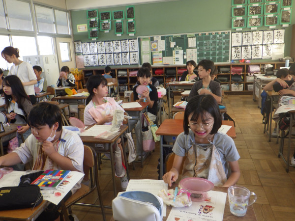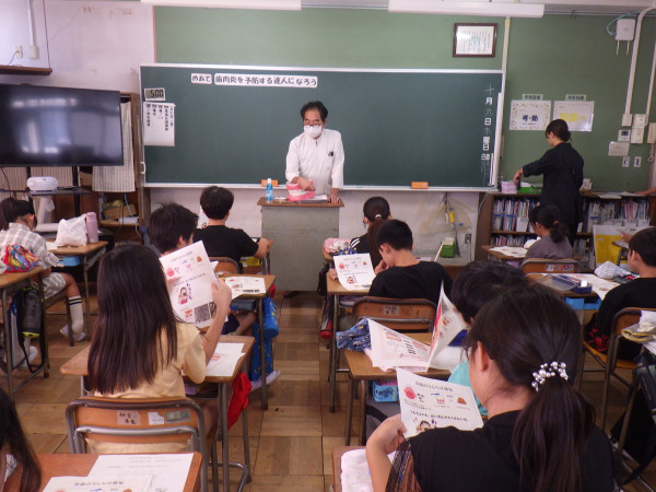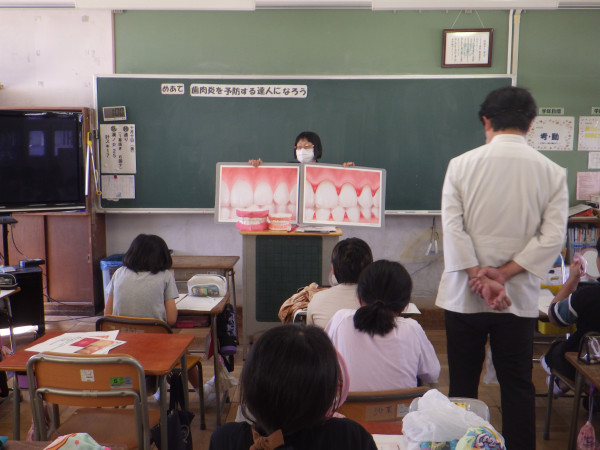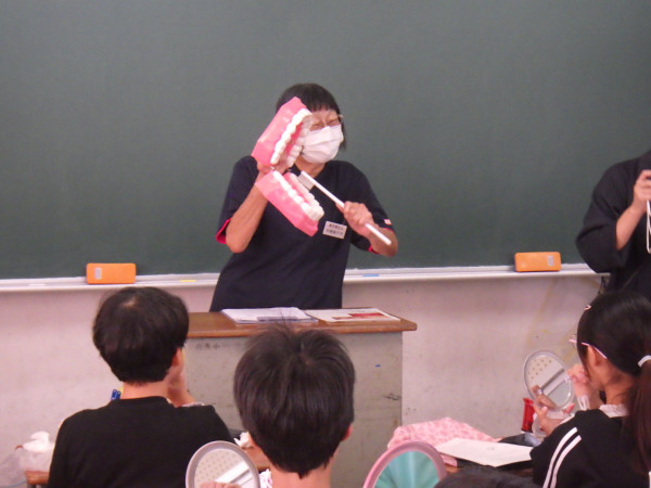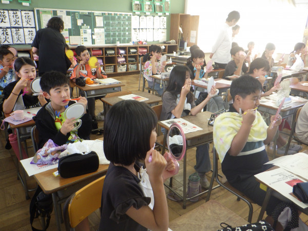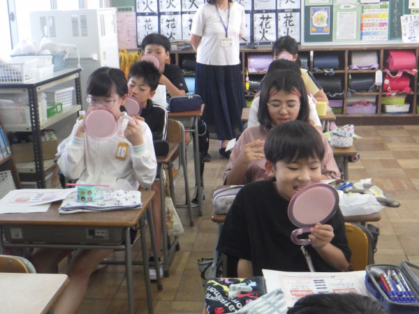 5年生は、歯肉炎について教えていただき、鏡で自分の口の中をチェックしながら、歯肉炎になっていないかを確認する様子が見られました。