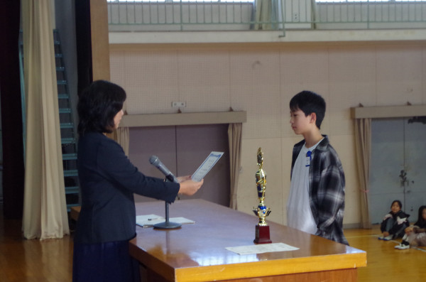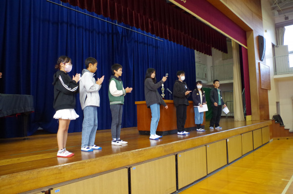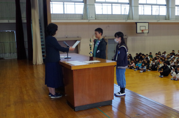 後期児童会役員の認証式を行いました。前期児童会役員より、後期も学校を盛り上げて欲しいとの思いを引き継ぎ、後期児童会役員がみんなの前で決意を新たに挨拶をしました。