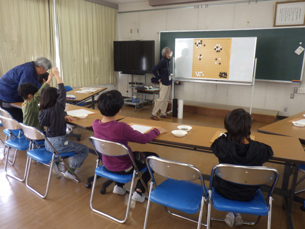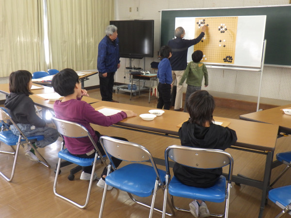 今回は、いくつかの問題を提示していただき、皆で碁石の囲み方、つなぎ方を考えました。短い時間ですが、子どもたちにとって、頭を働かせて考えるとてもよい時間になっています。白鳥子ども応援団の皆さん、今日も白鳥小学校の子どもたちのために、ありがとうございました。
