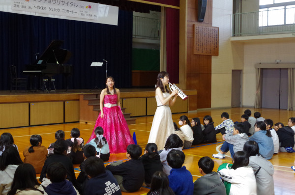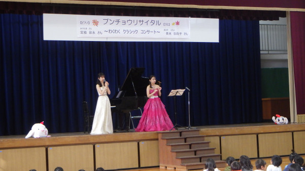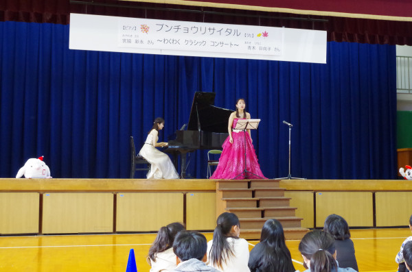 11月17日(月)に昨年度に続き2回目の「ブンチョウリサイタル~わくわくクラシックコンサート~」を開催しました。本校出身で声楽家の青木日向子さんと、ピアニストの宮脇彩永さんをお招きし、児童、教職員、保護者・地域の皆様で「芸術の秋」にふさわしい音楽を味わう時間をともにしました。