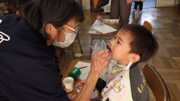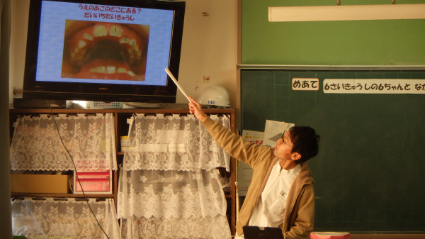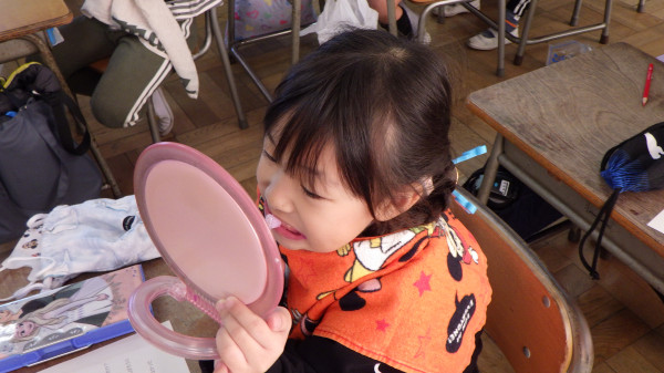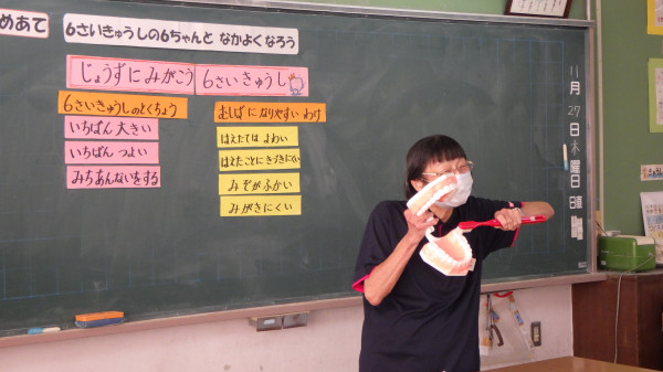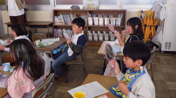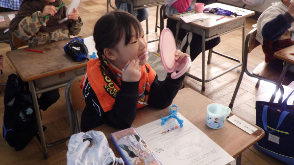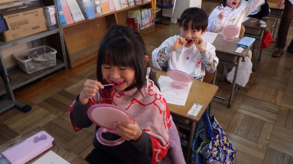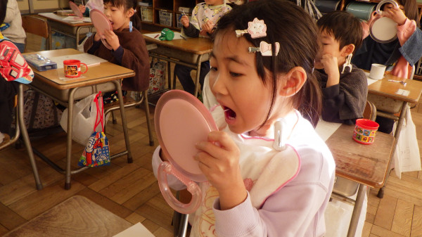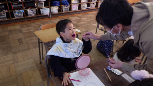 バトンタッチ運動(歯科保健教育)で、学校歯科医さんと歯科衛生士さんに来ていただきました。6歳臼歯の特徴や虫歯のなり方について教えていただきました。その後、歯のそめ出しを行い、真っ赤に染まった歯を見て、子ども達は驚いていました。磨き残しや磨きにくい場所を実際に鏡で覗いて確認し、歯の磨き方のポイントも教えていただきました。