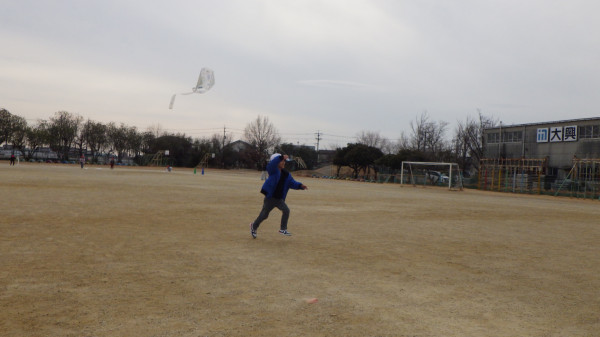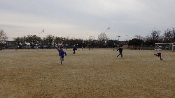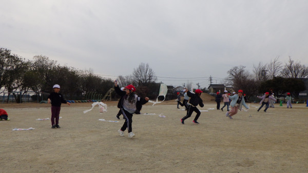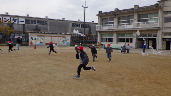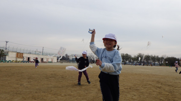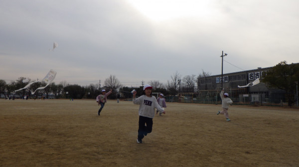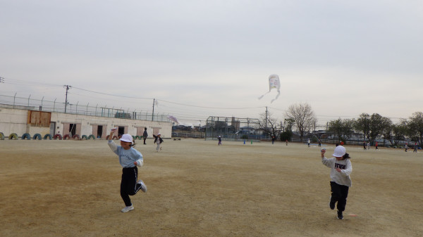 生活科で凧あげをしました。凧に自分達の好きな絵を大きく描きました。運動場を思いっきり駆けながら、凧が風を受けて高く上がっていく様子を楽しみました。