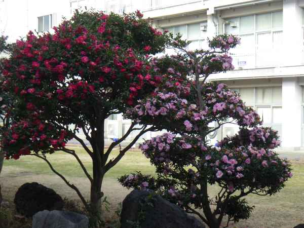 山茶花の花と言えば、紅色の花が真っ先に思い浮かびますが、白鳥小学校の山茶花は、紅色だけではなく、ピンク色の山茶花も咲いていて、とても素敵な風景になっています。ご来校の際は、是非ご覧ください。